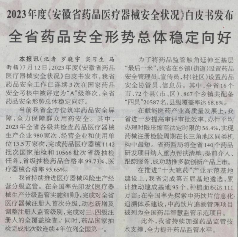 全省药品安全形势总体稳定向好