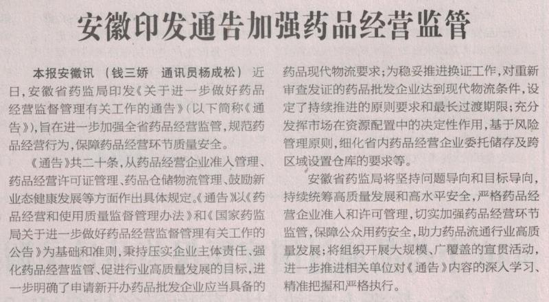 安徽印发通告加强药品经营监管